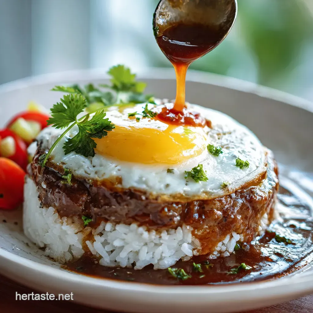 Beef patty, rice, gravy, and a fried egg are non-negotiable. The standard gravy combines beef broth, soy sauce, and Worcestershire sauce thickened with cornstarch.