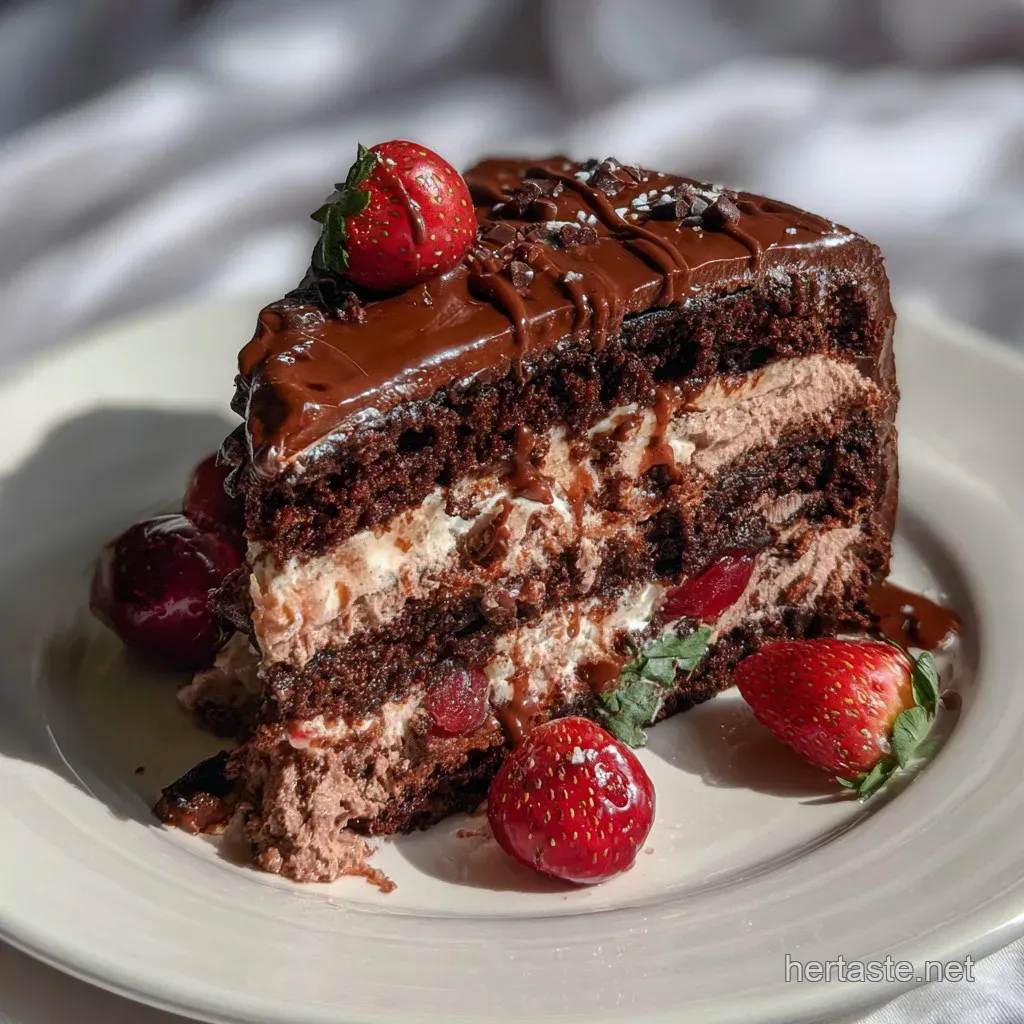 The recipe is rated as Medium difficulty, suggesting it is best suited for bakers who have some experience with layer cakes and frosting techniques. While the basic cake is straightforward, the assembly of the multi layered structure and achieving a smooth, thick coating of dark chocolate frosting requires careful attention.
