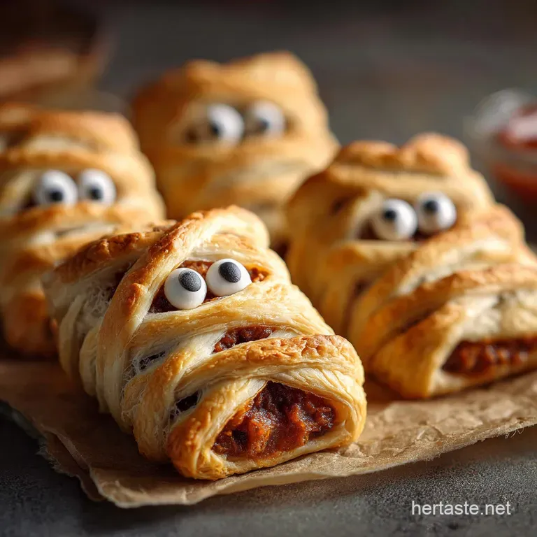 That smell when the flaky pastry hits the oven? It’s pure, comforting magic, turning richly seasoned sausage and sage into a golden, slightly ridiculous nightmare. The crisp outer shell gives way to a warm, juicy filling that just screams autumn comfort, even though these little guys are dressed like ancient Egyptian horrors.